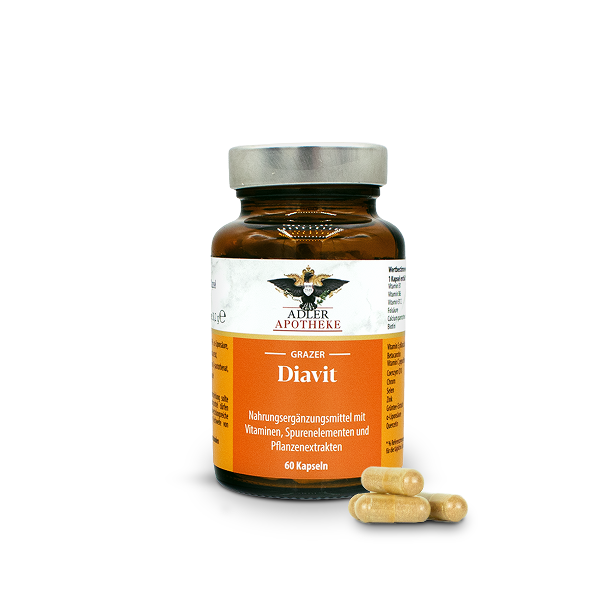 Inhaltsstoffe: 1 Kapsel enthält: 2,1 mg Vitamin B1, 3 mg Vitamin B6, 3 µg Vitamin B12, 400 µg Folsäure, 5,8 mg Calc.pantothenat, 100 µg Biotin, 15 mg Vitamin E pflanzlich, 3 mg Betacarotin, 50 mg Vitamin C gepuffert, 10 mg Coenzym Q10, 100 µg Chrom, 100 µg Selen, 12 mg Zink, 75 mg Grüntee-Extrakt, 50 mg α-Liponsäure, 50 mg Quercetin