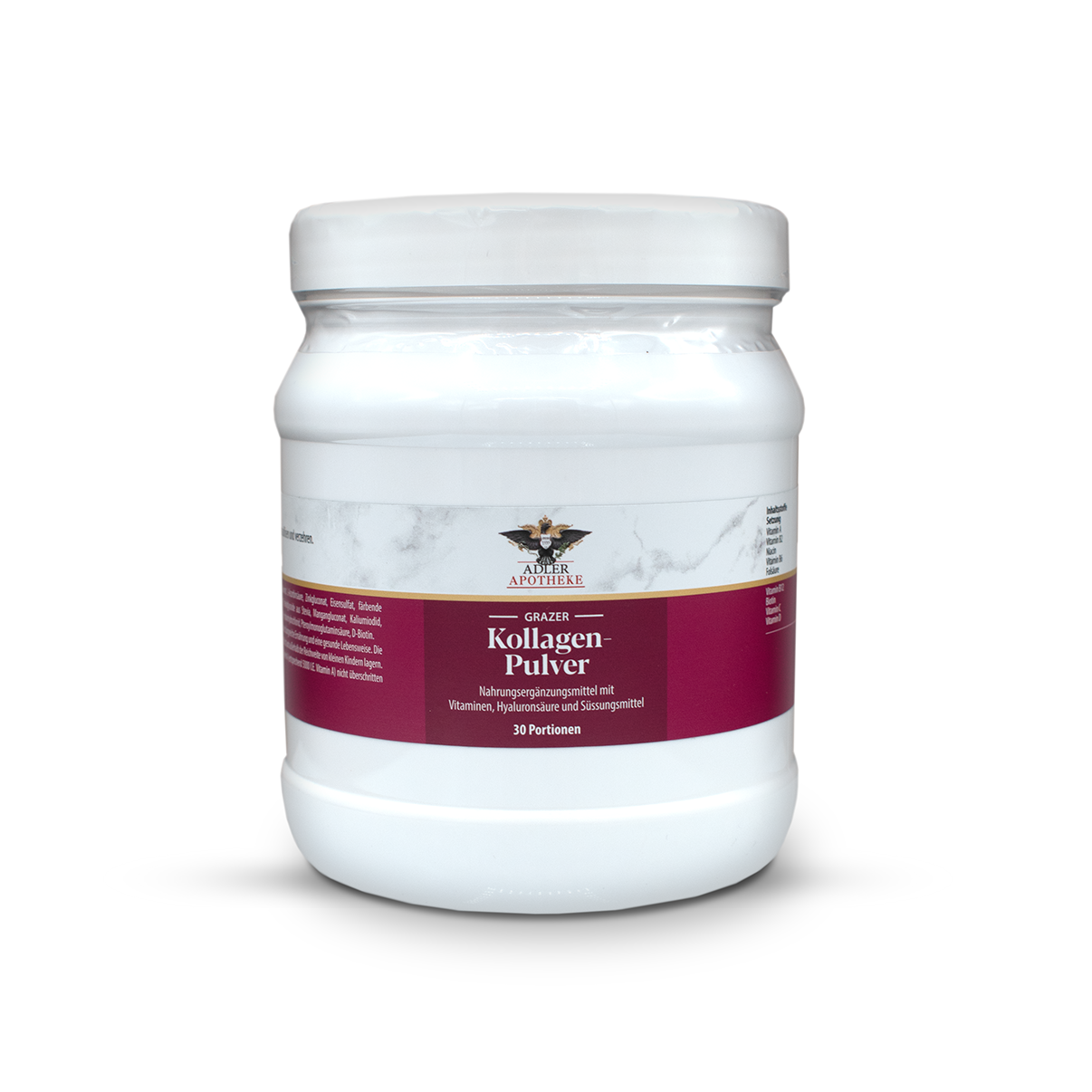 Zutaten: Kollagenpeptide (Rind), Dextrose, Aroma, Säuerungsmittel: Citronensäure, Natriumhyaluronat, L-Ascorbinsäure, Zinkgluconat, Eisensulfat, färbende Lebensmittel (Konzentrate aus Karotte und Heidelbeer), D-alpha-Tocopherylacetat, Süßungsmittel: Steviolglycoside aus Stevia, Mangangluconat, Kaliumiodid, Nicotinamid, Retinylacetat, Kupfergluconat, Cholecalciferol, Natriumselenit, Cyanocobalamin, Riboflavin, Pyridoxinhydrochlorid, Pteroylmonoglutaminsäure, D-Biotin.